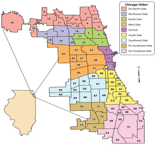 - The “Sides” of Chicago. Chicago Studies. Available online: https://chicagostudies.uchicago.edu/sides (accessed on 12 May 2021).