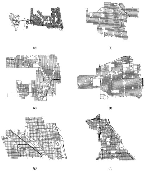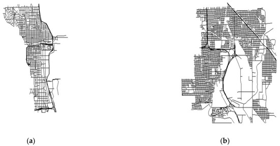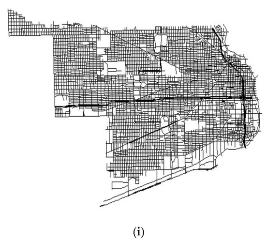A street network can be formulated as an undirected graph: G (V, E, W). Here, V (i.e., vertices) corresponds to a street intersection, E (i.e., edges) denotes a street segment between two intersections and W (i.e., weight) is the segment length. Based on this formulation, we firstly created a main graph from a street centerline shapefile. All the shapefiles were retrieved from the City of Chicago Open Data Portal (https://data.cityofchicago.org/, accessed on 4 July 2021). Each feature in this graph corresponds to a street segment with the following attributes: segment ID, object IDs, GPS coordinates of involved intersections, and length. We then spatially joined these street segments to the nearest community areas specified in community areas boundaries shapefile. Given each community area is only related to one side, segments were automatically mapped to relevant sides, creating separate networks. Street segments were spatially joined with the nearest community area by using NNQGIS plug-in of QGIS 3.6.0 Software. Then, we obtained a continuous network by excluding all the independent street segments that remained outside of the main component. To do this, we identified components of resulting side networks using spatstat package in R and excluded all the segments independent of the main component (i.e., comprised of the majority of street segments). We thus ensured the fully connected street networks for each side, which was instrumental because disconnected networks might complicate the results of any spatial analysis by deviating distance calculations [53]. The resulting networks are displayed in Figure 2. Descriptive information is summarized in Table 1.