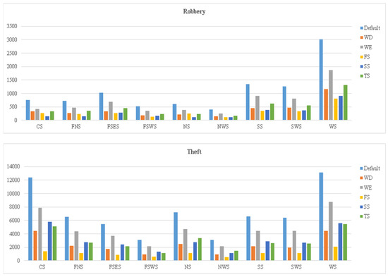 The Chicago crime dataset consists of all criminal incidents from 2001 to the present. Each row in this dataset represents a crime incident with 22 attributes including crime ID, date-time, x and y coordinates, the primary description of the crime, the neighborhood, and the community area. Our sample consisted of theft (n = 64,024) and robbery (n = 9685) incidents in 2018. The Chicago crime dataset was retrieved from the City of Chicago Open Data Portal (https://data.cityofchicago.org/, accessed on 4 July 2021). To examine the spatiotemporal influence analysis, we aggregated crimes at sides and at three separate temporal levels: default, intraday, and weekly. In the first level, we matched each incident with relevant side street networks in the community area field without any time differentiation (default). In the second level, the incidents were assigned to one of three equal shifts during a day, the first shift (FS) from 00:00 to 07:59, the second shift (SS) from 08:00 to 15:59, and the third shift (TS) from 16:00 to 23:59, based on the hour of occurrence. These shifts were defined based on the working watches of Chicago police officers [54]. In the last level, we used a weekend (WE) and weekday (WD) division to group incidents: the weekend covered all incidents between the third shift of Friday and the first shift of Monday (excluded), and the remaining incidents were included on weekdays. This procedure generated a total of 54 spatiotemporal models (9 default + 9 × 3 intraday levels + 9 × 2 weekly levels). Robbery and theft distributions across these models are displayed in Figure 3.