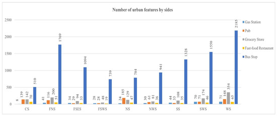 The locations of commercial features were retrieved from the Chicago business licenses dataset. With the guidance of business activity definitions for each record, we obtained unique instances of fast-food restaurants, pubs, grocery stores, and gas station records. For bus stops, the locations were retrieved from the CTA bus stops shapefile. The final dataset included fast-food restaurants (n = 402), grocery stores (n = 1330), gas stations (n = 350), pubs (n = 810), and bus stops (n = 10900), for which significant influences were reported in Chicago studies [30,38,43,55,56]. The distribution of these features across the sides of Chicago is displayed in Figure 4.