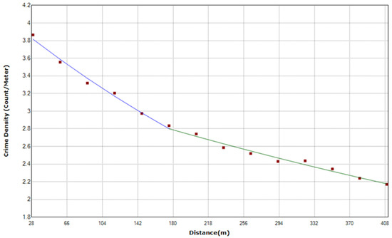 In this study, each observation (xi, yi) consisted of a network distance and a corresponding cumulative crime density. The linear K cross function that we used for network K analysis outputs expected number of events at 513 equal points, marking equal distances within a bounding radius (i.e., maximum shortest path distance between any two points in a linear network). The bounding coordinates, radius, and distance chunks corresponding to the distance between these 513 points are reported in Table 1. To estimate the segmented regression models, we used an adequate number from these observations that cover at least 400 m in a side network. For example, we used 21 observations for the center subnetwork with a chunk distance of 19.4 (19.4 × 21 = 407.4 m) and 10 observations for the West side (40.4 × 10 = 404 m) with a chunk distance of 40.4 m. To create risk signal functions, we estimated segmented regression equations using Joinpoint Regression program to model crime density as a linear function of network distance (i.e., spatial influence) within a spatial extent. A sample risk signal function is displayed in Figure 5. We evaluated the performance of risk functions with RMSE and MAE.