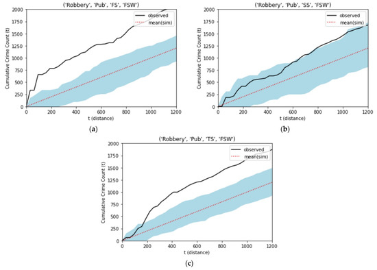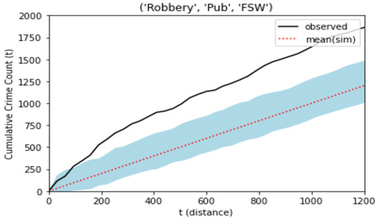 Here, if , then it can be concluded that a is clustered around b, otherwise, if , then it can be concluded that a is dispersed around b. The comparison of and invokes the calculation of the expectation in (1), that can be analytically evaluated through the complete spatial randomness (CSR) hypothesis. This CSR hypothesis posits that the different types of points are independently and identically distributed according to the binomial distribution over network space. In this study, we tested CSR with a Monte Carlo simulation that generated 39 complete spatial random point patterns for crimes and urban features on a network, . For each simulated pattern, the number of crime incidents on distance t from an urban feature were calculated on a network. The minimum and maximum values at distance t, obtained from these simulated point patterns, are the critical upper and lower values at the α = 0.05 significance level [60]. If the observed count of crimes exceeded the upper value, we could assume a significant clustering; if it was below the lower value, we could assume a significant dispersion, otherwise, the relationship was insignificant. We ran separate network K analysis for each of 54 spatiotemporal models on the spatstat package [61] on R for evaluating the clustering of crime incidents around urban features. The Monte Carlo simulation helped to eliminate all the insignificant spatial influences before risk signal functions analysis.