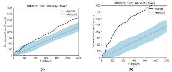 Network K results for robbery and pubs in FSWS during the (a) weekday and (b) weekend.