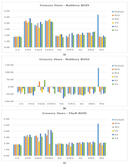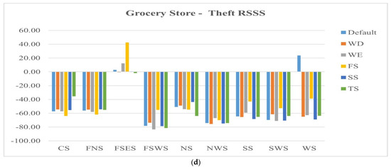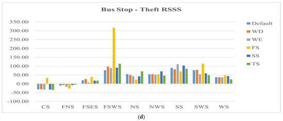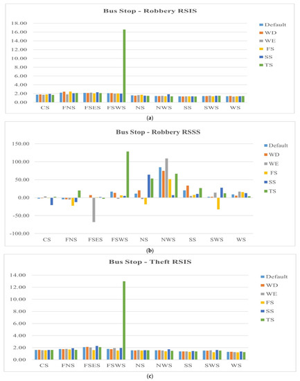 Figure 9 displays the RSIS and RSSS values of the bus stop in robbery and theft incidents across spatiotemporal models. The results of the Wilcoxon signed rank test indicated that theft RSIS of bus stops in the default model was significantly increased in the second shift (p-value < 0.01) and decreased in the first shift (p-value < 0.05). It also indicated a higher robbery RSIS during the first shift (p-value < 0.05). We observed significantly higher RSSS of theft than that of robbery in the first shift. The Kruskal-Wallis test showed a lower RSIS of theft and robbery than that of fast-food restaurants and grocery stores in general. This relationship was reversed for RSSS values, as bus stops mostly had positive RSSS values. The tests revealed a significantly higher theft and robbery RSISs of bus stops located in the FNS, FSES, and FSWS. For RSSS, bus stops were found to have the lowest values in both crime types in the CS and NS.