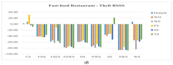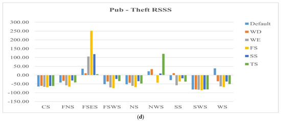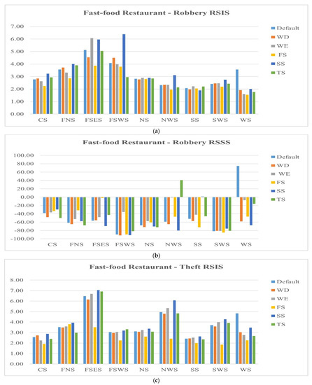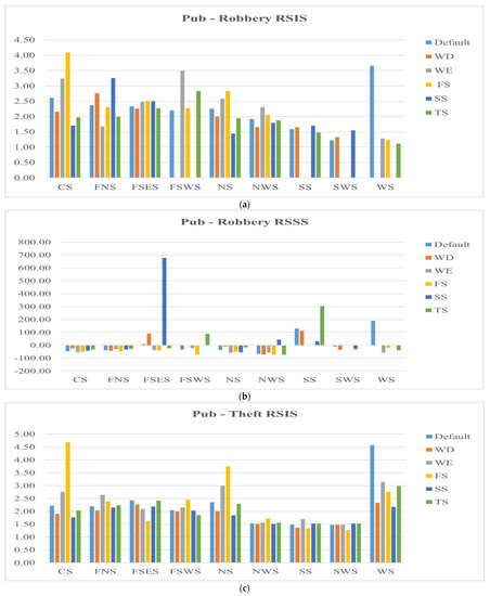 The results of spatiotemporal influence analysis of pubs are displayed in Figure 13. They indicated that theft RSISs of pubs in default and weekday models were significantly higher than the weekday (p-value < 0.05), and lower than the weekend (p-value < 0.05) model. We also found lower robbery RSSS values in the first shift than in the default model. It also reported greater robbery RSSSs in the second shift. The results also indicated robbery and theft RSSSs of pubs were significantly lower during weekdays, second shift, and third shift than that of fast-food restaurants. The Kruskal-Wallis test revealed significantly lower robbery RSISs of pubs on the SW and SWS, and theft RSISs on the SS, SWS, and NWS.