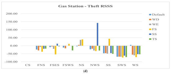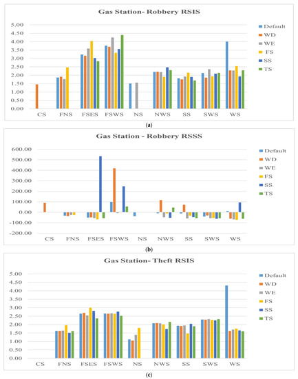 The analysis results of gas stations are displayed in Figure 11. The Wilcoxon signed rank test indicated that robbery RSIS was significantly higher on weekends when compared to theft values (p-value < 0.05). We also found higher robbery RSSSs on weekdays. A comparative analysis with other features showed significant theft intensity differences between gas stations and fast-food restaurants across all temporal models. For RSSS, this difference was significant in robbery across the default, weekday, and second shift model. Further tests revealed a significantly higher robbery intensity around gas stations on the FSES and FSWS sides, as well as higher theft intensity in FSES, FSWS, and SWS. For theft RSSS, the SWS was consistently found to have the smallest values.