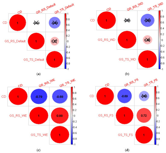 The main results found that some RSIS and RSSS values of urban features for different crime types moderately correlated with both each other and with the concentrated disadvantage of the sides. We found strongly correlated theft and robbery RSISs around bus stops in all temporal models. For gas stations, the correlation analysis revealed an increased crime intensity in disadvantaged neighborhoods (Figure 14 and Figure 15). Likewise, a strong correlation was observed between CD and theft (ρTheft, CD = 0.92) and robbery (ρRobbery, CD = 0.76) intensities in the second shift models.