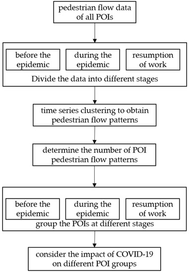 As one of the biggest public health and safety events in recent years, COVID-19 has had a considerable impact on the whole world. As governments introduced corresponding prevention, control, and isolation measures, the epidemic crisis in the vast majority of regions was greatly alleviated, and all of society gradually returned to normal operation. From normal operation to the sudden impact of the epidemic on the restoration of production order, almost all regions have gone through these three stages mentioned above. People adopt different travel patterns at different time stages, leading to different patterns of pedestrian flow gathering in different POIs.