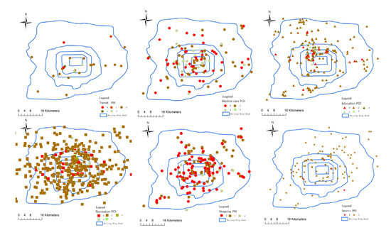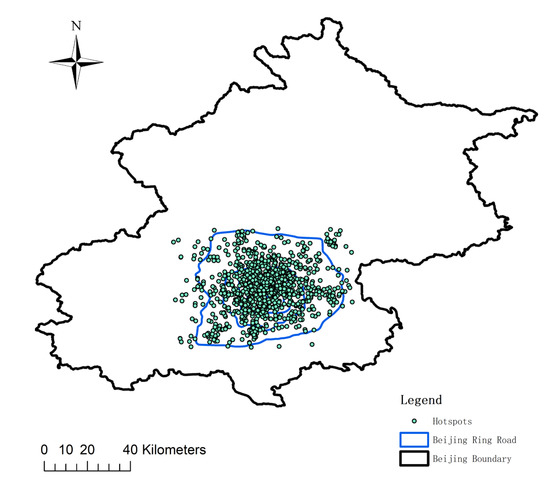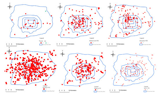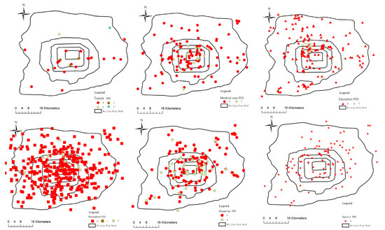 The data include almost all hotspot locations within the Sixth Ring Road of Beijing, as shown in Figure 2, and also cover the land use types of travel destinations within Beijing, mainly including the six major categories of Transit POIs, Medical care POIs, Education POIs, Recreation POIs, Shopping POIs, and Sports POIs; they are also subdivided into 14 subcategories, with a total of 997 hotspot locations, as shown in Table 1.