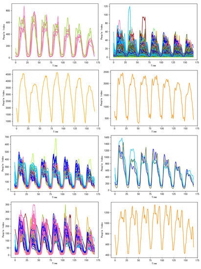 From the perspective of different groups of pedestrian flow patterns, there are several overlapping patterns of pedestrian flow, as shown in Figure 8a,b. Overlapping patterns indicate that POIs with different functional categories have similar flow patterns at this stage, as shown in Figure 8a, mainly including Shopping, Education, and Medical care. The high number of pedestrians and high concentration mean that these POIs in Figure 8a have greater appeal and more specific functions. Not only can these POIs attract more visitors, but visitors are more inclined to visit them in the same period, which causes this cluster of high flow and high concentration. The exciting thing is that the pedestrian flow curves in Figure 8b exactly fill in the blank part of the bottom half of Figure 8a. The low number of pedestrians and low concentration mean that these POIs in Figure 8b have less attractiveness and more diverse functions, even though there are POIs of the same category in Figure 8a,b. Due to their ultra-high numbers of pedestrians, almost all traffic hubs are in the third and fourth clusters, with consistent behavior in the flow pattern.