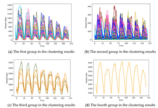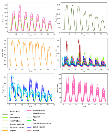 Taking the pre-epidemic control phase as an example, each hotspot location was represented as an N-dimensional vector, where N denotes the time span of this phase; e.g., the pre-epidemic control phase is from 0:00 on 17 January 2020 to 0:00 on 15 February 2020, so N for this phase is 168. The clustering method used was K-means clustering [34]. The K value in the K-means clustering method is used as a hyperparameter, which is to be set empirically before clustering. Since all the hotspot locations to be classified involve a total of 14 sub-clusters based on functional categories, we started by setting K to 14. The results of the clustering are shown in Figure 3.