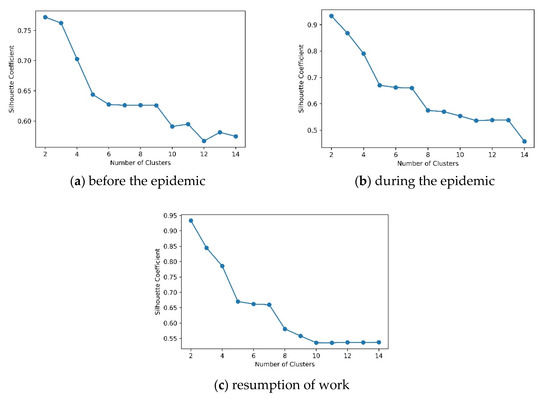 For sample i, the Silhouette coefficient s(i) has a range of [−1, 1]. The closer s(i) is to 1, the higher the probability that sample i is clustered into the correct category, and the closer s(i) is to −1, the higher the probability that it is clustered into the wrong category. For the K value chosen for clustering, the corresponding Silhouette coefficient is the mean s of the Silhouette coefficient of all samples obtained after clustering them into K-many clusters. As with the comparison method for individual samples, the larger the s value corresponding to the K value, the closer the samples clustered into the same cluster in the clustering result, the more distant the samples clustered into different clusters, and the more reasonable the choice of the K value for clustering. Since the mean value of the Silhouette coefficient is used as the basis, the method is very sensitive to data outliers, resulting in potentially unreasonable results. According to the results in Figure 4, and based on the premise that the larger the value, the better the clustering result, the pattern of pedestrian flow should be divided into two types, regardless of the stage of the epidemic.