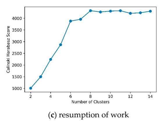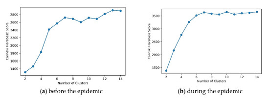 Compared with the Silhouette coefficient, the CH coefficient has advantages of low computational complexity and very fast computation speed, but it has the same disadvantages as the Silhouette coefficient. Since the calculation of the CH coefficient is based on the Euclidean distance between samples, it can reflect the clustering effect better for convex data set clustering, but it cannot be fully applied for a non-convex time series data set space as the data set will be divided into particularly fine pieces; it needs to be used together with other coefficients to judge the clustering results. According to the results in Figure 5, and based on the premise that the larger the value, the better the clustering result, the pattern of pedestrian flow should be divided into more than 10 groups, regardless of the stage of the epidemic.