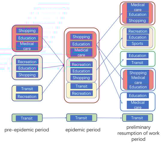 It can also be seen that the second group (Recreation, Education, Sports) in the initial resumption phase corresponds to the second group (Recreation, Education, Shopping) before the epidemic, where the main POI type is Recreation; this includes parks in the city with a low number of pedestrians and low concentration, indicating a gradual resumption of outdoor recreation and entertainment. The third group (Transit, Recreation), in which the Transit POI was the central part before the epidemic, is no longer evident after the epidemic, also indicating that intra-city traffic has still not recovered. The Transit POI group at the bottom of Figure 14 is not grouped with other POIs, regardless of the stage of the epidemic impact. This group of Transit POIs contains only one POI, the capital airport, due to the high number and concentration of pedestrians at the airport that cannot be reached by other POIs, which is also confirmed in Figure 9, Figure 10 and Figure 11. For Sports POIs, in the early stage of the epidemic, there was no obvious flow pattern characteristic, so there were no Sports POIs in each category of the clustering results, but in the early stage of the resumption of work, its flow pattern appeared in the second category of results, indicating that the epidemic made people consistently pay more attention to exercise to improve self-resistance.