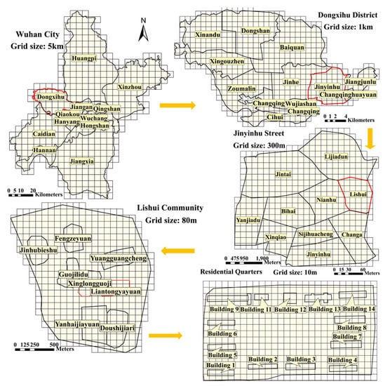 Quarantine measures usually take the “province–city–district–street–community–village–home” as the basic unit to limit the scope of people’s activity, which greatly reduces the contact between infected people and susceptible individuals. However, the uncertainty of the size and irregular shape of this traditional unit of prevention and control can cause great difficulties in the modeling. Moreover, more precise administrative division data are usually not easy for other authors to obtain. As shown in Figure 1, the prevention and control units of “city–district–street–community–home” can use different levels of the grid to make up for the difficulty of data acquisition and the irregular shape, and the effective grid regions were limited within the effective areas within the administrative division. According to the spatial features of physical quarantine, the discretization of the geospatial area was realized by a multi-level discrete grid with different sizes and series of grid units. An adaptive statistical unit can be formed by a hierarchical geographic grid to fill the traditional prevention and control unit. At the same time, the dotted and solid lines of the boundary and size of the grid can be used to describe the status and intensity of the quarantine in different regions, respectively, and the distribution of the grid can map the practical scope of the implementation of quarantine measures.