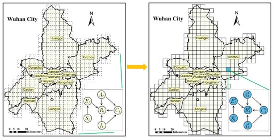 When quarantine measures were implemented, all of the grid boundaries changed from dotted to solid lines, and the current time was denoted t0. The activities of people were limited to within the sub-regions, meaning that COVID-19 could only diffuse in the infected grid regions and could not affect the other grid regions (Figure 2). The number of different humans in the sub-grid was denoted by , , , , and at time t, respectively. The numerical changes of each human were the sum of all sub-regions, as shown in the following Equations (7)–(12), where refers to the number of people in each grid cell, and its specific value was obtained from the statistical yearbook data using Kriging interpolation [50]: