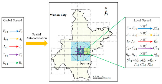 In the process of the transmission of COVID-19, the number of cases of newly infected people per day always has a time series change process that first increases and then decreases. Meanwhile, infected people are abstracted as many discrete points in geographical space. According to Tobler’s first law of geography, the process of the transmission of COVID-19, as restricted by geographical spatial factors, has strong spatial correlation characteristics [44]. The distance is used to describe the spatial weight concept of the infected grid cells, which could help to obtain the number of newly infected people at the next moment in the corresponding infected grid cell, as shown in Figure 3 and Equations (13) and (14). In addition, the number of people should be rounded in the distribution: