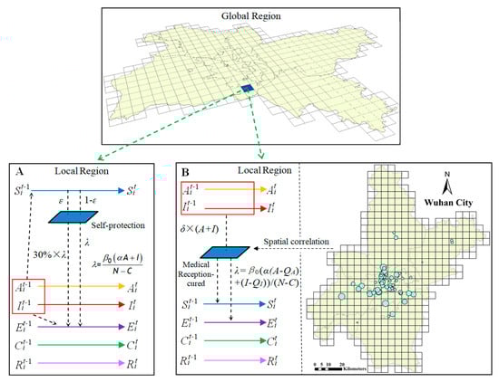 In this paper, we propose a COVID-19 prevention and control model based on a discrete grid. The goals of this study are two-fold: first, to evaluate and quantify the impacts of interventions by integrating a time series dynamic model of COVID-19 and spatial information; second, to establish a connection between the model parameters and the practical application significance, and not simply adjusting the mathematical parameters of the model to illustrate the effectiveness of the interventions. Our model parameters were the scope of the actual area and the intensity of the measures, which can provide better and more direct information for public health and safety emergencies policy [49]. Therefore, a multi-level grid was used to divide the geographical space of the epidemic area, and the status and intensity of the quarantine of the sub-region were described by dotted and solid lines of the boundary and the size of the grid, respectively. Then, a hospital isolation model was constructed by allocating medical capacity to the affected sub-region according to the correlation between the spatial distribution of hospitals and the sub-region. In addition, the parameters of means for human self-protection human (including wearing a face mask, washing hands frequently, and ventilation) were introduced into the dynamics model of COVID-19 to achieve the modeling of self-protection measures. In the absence of detailed behavior tracking data, we assumed that the means of transmission of COVID-19 mainly started from the space adjacent to the infected path and then gradually spread to the surrounding region (without any interventions) [50]. The spatiotemporal spread evolution of COVID-19 was simulated through the behavior features of residents’ daily activities based on the spatial correlation between sub-regions. Then, the COVID-19 dynamics model with asymptomatic infection was introduced for analyzing and quantifying the infectious situation of COVID-19 under the effects of different interventions. Since the absence of early epidemic data for Wuhan was caused by early interventions and the unknown nature of the virus, while the epidemic prevention and control measures abroad were applied relatively late and were lax [19], the early reported case data of the U.K., the U.S., Spain, and Germany were used to discuss the status of the spread of COVID-19. The parameters of a dynamic model of COVID-19 free spread were brought to Wuhan to obtain the infected curve of Wuhan without any interventions. Then, the potential of quarantine measures, hospital isolation measures, and self-protection measures to alleviate the spread of the epidemic at different scales and with different intervention times were discussed. Finally, the rationality and correctness of the model were evaluated with the actual data of Wuhan, including epidemic data, hospital distribution data, and medical attribute data. The novelties of this study are highlighted as follows: