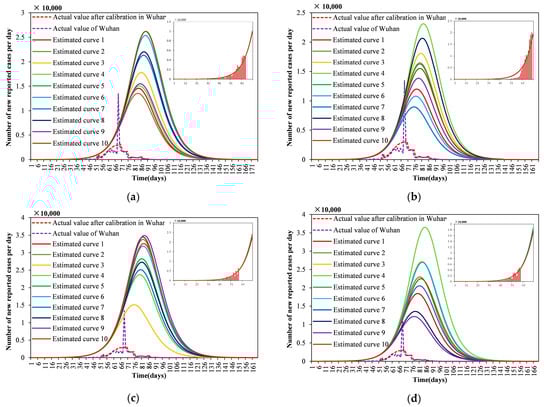 Table 4 shows that the number of asymptomatic infections was less than that of symptomatic infections in the early stage, which is consistent with the actual situation reported in Wuhan. The detection rate of symptomatic patients was also significantly higher than that of asymptomatic infections. The infection rate , asymptomatic detection rate , symptomatic detection rate , and basic reproduction number in the estimated parameters were roughly the same (the same countries), and the estimation of was similar to that of Wu [6], Zhou [7], and Wang [9]. However, the estimated values of , , and were quite different, mainly because it was difficult to confirm the actual number of infected people who had already exited but had not been tested or had no symptoms when the first case was found.