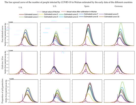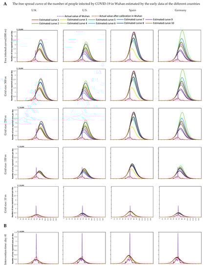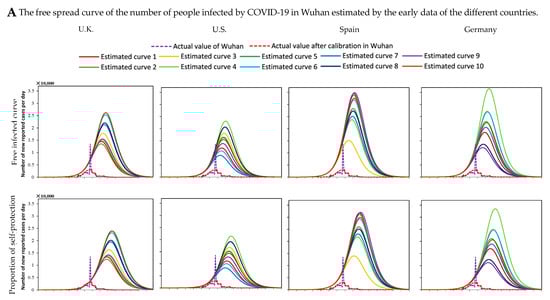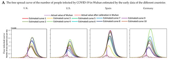 In order to compare the differences in the number of infected humans before and after the interventions, the curve of people infected without any intervention needed to be estimated. The first thing that needs to be made clear is that no country will allow infectious diseases to spread freely, which means that the freely infected curve representing the number of infected humans for any infectious diseases is usually not available. Recently, many studies have used the early epidemic data of the study area or random sampling of the basic reproduction number R0 to solve this problem [16,18]. Unfortunately, Wuhan was the first city that faced the COVID-19 epidemic. Due to the unknown characteristics of the virus and the rapid and intensive interventions carried out, the estimated number of infected humans detected at this early stage is very unreliable. Therefore, it cannot truly describe the early trend of the number of infected humans. However, as foreign epidemics occurred after the outbreak in Wuhan, the level of medical detection was high and interventions carried out in foreign regions were relatively late and lax [19]; it is more likely that these early epidemic data are consistent with the free spreading situation of COVID-19. However, the differences between different countries in terms of the patterns of movement of crowds and levels of economic development make it difficult to objectively clarify which country’s data are the most appropriate for simulating the free infected trend of COVID-19. Therefore, for this study, we selected early epidemic data from the U.K., the U.S., Spain, and Germany to create a curve showing the number of infected humans under conditions in which no interventions were carried out.