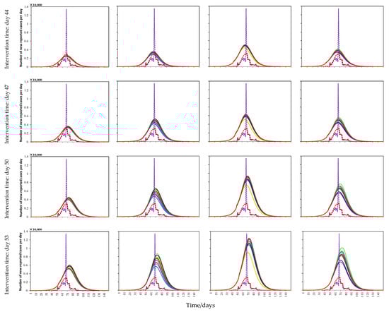 In this section, the actual quarantine, the number of medical beds, and the proportion of people effectively wearing face masks (a self-protection measure) were used to verify the reliability of the model. In terms of quarantine measures, we used a 10 m grid to approximately represent the home quarantine measures implemented in Wuhan; the intervention time was 24 January 2020, when Wuhan implemented a “lockdown”. For hospital isolation measures, there were 68 designated hospitals in Wuhan, including 16 fangcang shelter hospitals and “huoshenshan” and “leishenshan” hospitals, with a total of 38,782 beds. Thus, the proportion of beds was approximately 0.06; the intervention time was the time when the first batch of designated hospitals were put into operation (20 January 2020). Due to the fact that the total number of humans complying with the self-protection measures was difficult to obtain, the proportion of people taking self-protection measures in Wuhan was represented by the proportion of those effectively wearing face masks. We assumed that each medical member of staff used two face masks every day and that every citizen used one face mask every three days. Thus, Wuhan needed to consume 2.1744 million face masks per day as the total number of medical staff in Wuhan was approximately 108,720 (including local and support medical staff), and the total population of Wuhan was approximately 14.18 million. According to the statistics, Wuhan received a total of 55.1 million face masks (including N95 and medical–surgical masks) during the period from 3 to 13 February 2020. Therefore, we set the daily effective proportion of wearing masks to 0.1; the intervention time of self-protection measure was the time when a group of pneumonia cases with an unknown etiology was first described by Wuhan’s Municipal Health Commission (11 January 2020). The results are shown in Figure 9.