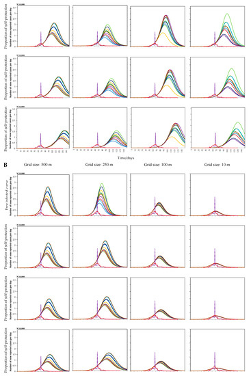 This section mainly discusses the influence of self-protection measures under different proportions of the effective self-protection of people and quarantines of different intensities to mitigate the spread of COVID-19. We used the intervention time of when a group of pneumonia cases with an unknown etiology were first published by Wuhan’s Municipal Health Commission as the baseline (11 January 2020, 35th day) and set the proportion of people using self-protection measures as 0.1, 0.2, 0.3, and 0.4 of the total number of humans (Figure 7A). Then, we adjusted the proportion of the population using self-protection measures () to 0.1, 0.2, 0.3, and 0.4 under grid sizes of 500, 250, 100, and 10 m, respectively (Figure 7B).