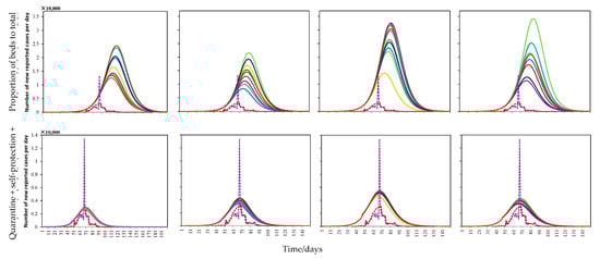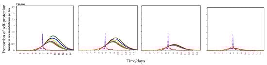 During the outbreak of COVID-19, people took many self-protection measures, such as wearing face masks effectively, washing their hands frequently, keeping their houses ventilated, and maintaining distance from patients with a fever. Clinical and infectious disease studies have shown that the implementation of proper self-protection measures can effectively reduce the risk of infection and the external spread of the virus by 70–80% [53]. In this study, the parameter was introduced to represent the proportion of people who undertake effective self-protection measures. The probability of the infection of susceptible humans undertaking effective self-protection measures was reduced to 30% of the normal value. In contrast, the rate of infection and external spread to other humans remained unchanged (Figure 4A).