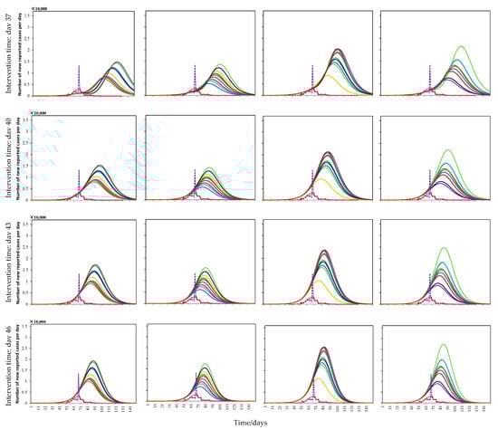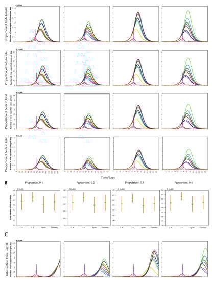 This section mainly discusses the influence of hospital isolation measures with different numbers of medical beds and different intervention times on mitigating the spread of COVID-19. The number of medical beds were calculated according to the percentage of people infected every day (including symptomatic and asymptomatic cases). We took the intervention time as when the first batch of hospitals was designated in Wuhan (20 January 2020, 44th day) and set the proportion of medical beds () to 0.1, 0.2, 0.3, and 0.4 (Figure 8A,B). Then, we fixed the ratio of the number of invested beds to 0.1 and adjusted the intervention time to the 34th, 37th, 40th, 43rd, and 46th days, respectively (Figure 8C).