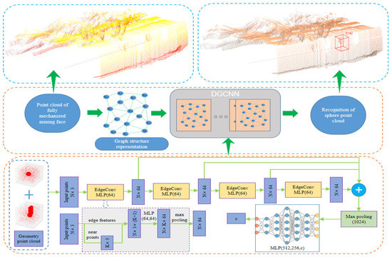 In addition, by reviewing the existing reports in the literature, we found that no study has been conducted on the use of DGCNN to process the point clouds of the FMMF. Moreover, from the existing literature [38,39,40], we know that DGCNN can effectively learn the characteristics of point clouds of bridges and sites of cultural heritage so as to process these point clouds. However, whether the DGCNN built by the author’s research group can be applied in the fields of mining engineering and geological engineering and how well it performs in extracting geometric features from the point clouds of the FMMF still need to be explored and studied. Therefore, in this research, the spheres in the point clouds of the FMMF are extracted by DGCNN. This provides the basis for the subsequent coordinate transformation of FMMF to geodetic coordinates using the sphere as the intermediate medium and then for the straightening and inclining adjustment of the scraper conveyor. At the same time, this is important for the intelligent and unmanned mining of the FMMF. Additionally, this study provides a reference for the application of DGCNN in energy- and geology-related fields.