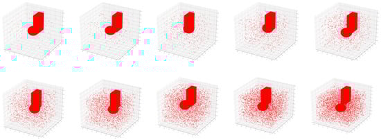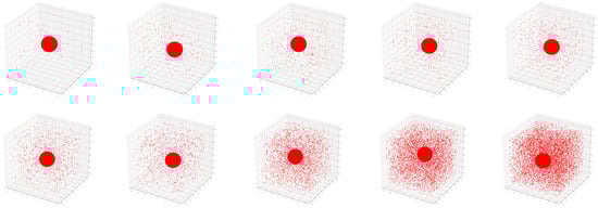 As shown in Figure 2, the positions of the sphere and the cuboid were random in the specified space, and the cuboid formed different degrees of cover for the sphere. In addition, in order to increase the robustness of DGCNN, we added different numbers of noise points to the point cloud of a single sphere and the point cloud of a combination of a sphere and cuboid, as shown in Figure 3 and Figure 4.