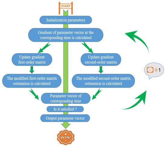 In the Adam algorithm, g is the gradient of random objective function f. After setting the parameters in the first step, at step t, the values of the first-order moment estimation ht and the second-order moment estimation rt are calculated using Equations (3) and (4).