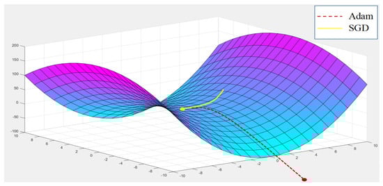 According to existing research [46], when the above two optimization algorithms encounter a saddle model, the SGD algorithm cannot escape from the saddle bottom (the result of the SGD algorithm is the local minimum), as shown in Figure 6.