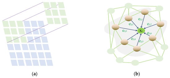 In Equation (9), is the center point, is the point adjacent to the center point, , and Θ is the learnable parameter. Therefore, is a nonlinear activation function composed of the parameter Θ. The MLP is used to calculate the features of all the associated edges and the features of the center so as to obtain the high-dimensional features of the graph structure. The output of the center point on the graph structure can be expressed using Equation (10):