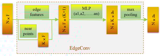 Edge convolution in DGCNN uses the connecting edge between two interconnected nodes to represent the feature information synthesis of two interconnected nodes, then aggregates the feature information of multiple nodes interconnected with the central node through a series of nonlinear transformations so as to express the local features of the central node [47].