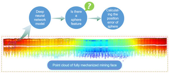 At present, the processing technology of three-dimensional point cloud data is being applied more and more frequently in the mining field [1,2,3]. The national robotics engineering center of the United States can successfully draw a high-precision, three-dimensional map of underground roadways using the point cloud data obtained by a three-dimensional laser scanner and then propose an intelligent mining mode based on the three-dimensional map [4]. Using three-dimensional point cloud data to describe and draw the whole FMMF can accurately and intuitively reflect the spatial position relationship between the coal wall and fully mechanized mining equipment [5,6,7,8]. This can provide the direction information of a scraper conveyor so as to adjust the displacement of the hydraulic support in a timely manner. Therefore, we arranged markers in the FMMF and then found the markers in the point cloud of the FMMF (in this study, we arranged the sphere under hydraulic support in the FMMF and used the sphere as the marker). In subsequent research, we took the marker as the intermediate medium to transform the point cloud data of the FMMF to the national geodetic coordinate system for analysis. This is not only of great significance for the straightening and inclining of the scraper conveyor and improving the mining efficiency and safety of coal mines and other mines, but it is also an important means to realize intelligent and unmanned mining in the mining field.
