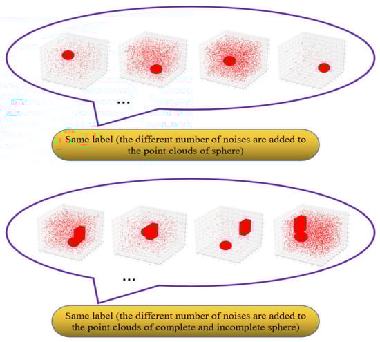 We labeled the complete sphere and incomplete sphere point clouds after adding the different levels of noise and completed the production of the point cloud training set according to the method described in Section 2.1. Part of the point cloud training set is shown in Figure 13.