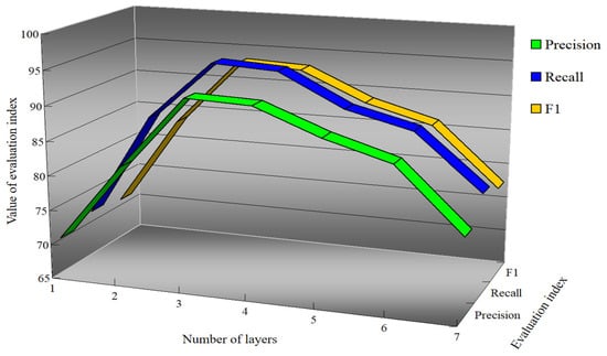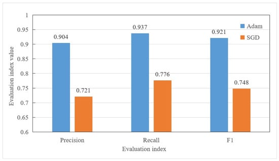 After determining the number of edge convolution layers of DGCNN, the precision, recall, and F1 of DGCNN under different optimization algorithms were analyzed, as shown in Figure 21.