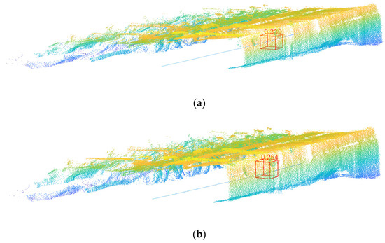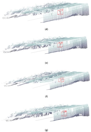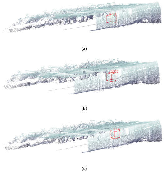 The number next to the box in Figure 18 represents the position error between the sphere recognized by DGCNN and the real sphere. The number of edge convolution layers of DGCNN increased from one layer to seven layers, and the position errors were 0.343, 0.364, 0.235, 0.142, 0.161, 0.193, and 0.286 m, respectively. It can be seen that with the increase in the number of edge convolution layers, the position error of the sphere first decreased and then increased. When the number of edge convolution layers was three, the position error of the sphere was the smallest, and the performance of the DGCNN was the best. These findings are consistent with the conclusion of the best number of edge convolution layers of DGCNN according to precision, recall, and F1.