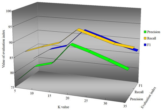 In the edge convolution, K edge features around the center point were constructed to represent the relationship between the center point and adjacent points. We adjusted the K value inside the edge convolution layer. The precision, recall, and F1 of the DGCNN when using different K values are shown in Figure 19.