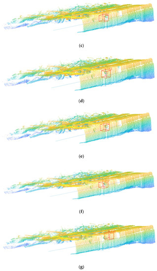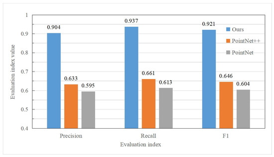 The essential difference between DGCNN and PointNet is that DGCNN innovatively designs a critical module called edge convolution, which enables DGCNN to learn the local features of point clouds. PointNet is equivalent to DGCNN without edge convolution [47]. Therefore, we compared the improved DGCNN with PointNet and PointNet+. This is not only the result comparison of different depth neural network models but also the result of comparison to an ablation study of DGCNN without edge convolution. The precision, recall rate, and F1 of the three methods are shown in Figure 23.