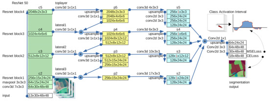 Recent advances in computer vision suggest that Features Pyramid Networks (FPNs) [10] are very effective in detecting objects at different scales, but they are also a great tool for many image segmentation problems [17,18]. However, traditional FPNs are designed for 2D images. Here, we propose an FPN network that uses 3D kernels on the input time series and on almost the entire network, except on the last layers near the output where we use 2D kernels to be able to segment a map.
