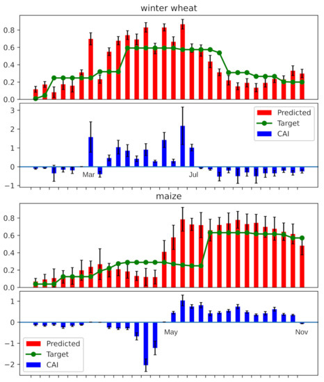 Moreover, the proposed approach has a two-fold importance: demonstrate the capacity of the network to correctly interpret the physical process investigated and provide additional information to the end-user (i.e., crop presence and its temporal dynamics. The provision of CAI output is a way to assess robustness of model for each semantic class because provide an explicit representation of the time period in which crop is likely to be cultivated, such information for a specific study area can be confirmed by expert knowledge or provide added value information for final user. Figure 1 provides a graphical representation of CAI information for a spatial subset of the analysed S2 data where maize is cultivated. Low CAI values occur at the beginning of time series (December to May) when crop residue (other crop) are present while the indicator values significantly increase in the proper growing period (May to September).