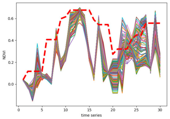 The continuous colored curves are the real NDVI of all the “winter wheat” class pixels available in a patch of size 48 × 48 pixels, in one year (30 samples). While the red dashed curve represents the average value computed by us. Note that the average value is always positive because we filtered the signal with a RELU function.