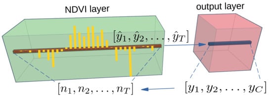 Note that the loss of Equation (5) can be computed in parallel, but the NDVI layer must be placed before the output segmentation layer if we want each output class label to depend on NDVI values. If we put the two layers in parallel, we cannot say anything about the dependence between class label and NDVI activation with respect to the input time series and therefore we cannot calculate the CAI.