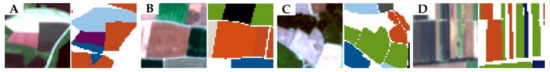 (A)–(D) Four random samples of input-output pairs from the Munich dataset. The input on the left is shown as an RGB image, while the output shows the class labels as colors.