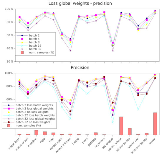 Analyzing the overall accuracy (OA), Kappa, weighted Recall (w.R), Precision (w.P) and F-measure (w.F1) in Table 2 and the graphs in Figure 7, we can see that loss function weighting techniques do not lead to any advantage on this dataset. On the other hand, it should be noted that the batch size (see the second column labeled batch in Table 2) has a great influence on the result and then a very small batch size allows to obtain the best results. From Table 1) we see that the class that has the lowest number of pixels (column #pix) on the validation set is the asparagus class. While in Figure 7 the effect of the weight of the loss function and the effect of the batch size can be analyzed as a function of the number of samples for each class. Analyzing, for example, the asparagus class when the weight for all the classes (plot on the top of Figure 7) we can see that the best results are obtained when we use a small bach size. As a consequence of these experiments, in the other experiments we do not use the weight .