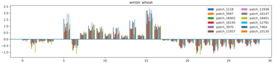 To understand how the CAI changes with the variation of the patch on which it is calculated, we have taken into consideration the winter wheat class and calculated all the CAI vectors on the entire test set. We show in Figure 8 an aggregate mean value for each patch, and we can see how the time interval associated with this class does not change according to the patch, even if the average activation values change slightly. The network used in this experiment uses Resnet 101 as a bottom-up block and the numerical results are reported in Table 1.