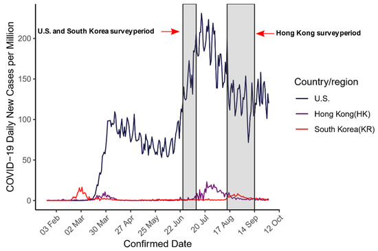 The Hong Kong survey was conducted from 14 August to 14 September 2020. Participants were recruited through WhatsApp, WeChat, and Twitter. A total of 149 participants returned complete surveys. Thus, in the end, we obtained a total of 455 complete surveys from participants from all three study areas. Note that, although the COVID-19 situations in the United States, South Korea, and Hong Kong were different during the survey periods (Figure 1), all of them had experienced the pandemic for 6 or more months, and at least one significant peak in confirmed COVID-19 cases had happened by the time of the surveys. The study protocol and survey questionnaire were reviewed and approved by the Institutional Review Boards (IRBs) of the authors’ universities.