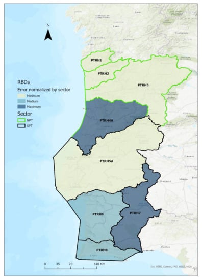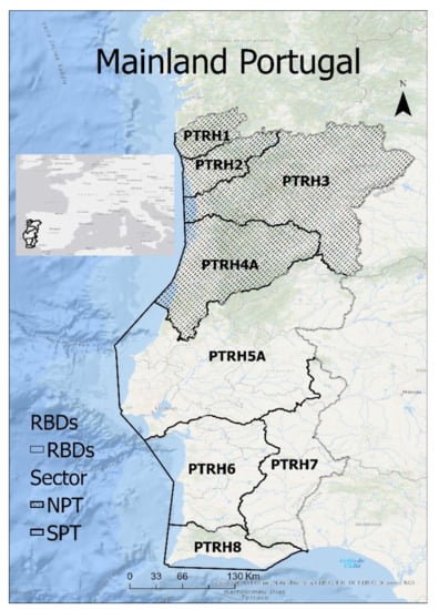 This research is following the Water Framework Directive (WFD) implemented for mainland Portugal comprising 8 RBDs (PTRH1 to PTRH8). The river basins districts that cover Portugal continental were studied organized by two sectors (NPT and SPT) as showing in Figure 1. The boundaries of the RBDs are displayed using version 1.4 of the Water Information System for Europe (WISE) River Basin Districts dataset provided by the European Environment Agency [29]. This dataset is based on data reported to WISE by the EU Member States.