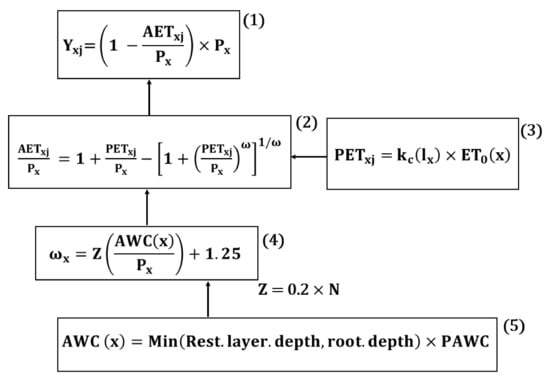 The InVEST WYM approach relates (AETxj) to (PETxj) using Equation (2), which was developed by Budyko and later adapted by [31]. Actual evapotranspiration on pixel x is estimated in a spatially explicit way considering (PETxj) defined as the potential evapotranspiration for pixel x on land use type j, and ω is an empirical parameter which defines the shape of the curve relating potential to actual evapotranspiration expressing climate–soil properties [7]. PETxj can be calculated by Equation (3) in Figure 2 where Kc(lx) is the vegetation evapotranspiration coefficient associated with the land use type (lx) in each pixel. In (4) ω(x) is related to the average annual values of available water capacity (AWC), precipitation, and the Zhang parameter (Z) which is positively correlated with the number of rainfall events (N) per year (Z = 0.2 × N) [4]. AWC(x) is estimated as the product of plant-available water content (PAWC) on pixel x, the minimum of root restricting layer depth and vegetation rooting depth as showing in Equation (5).